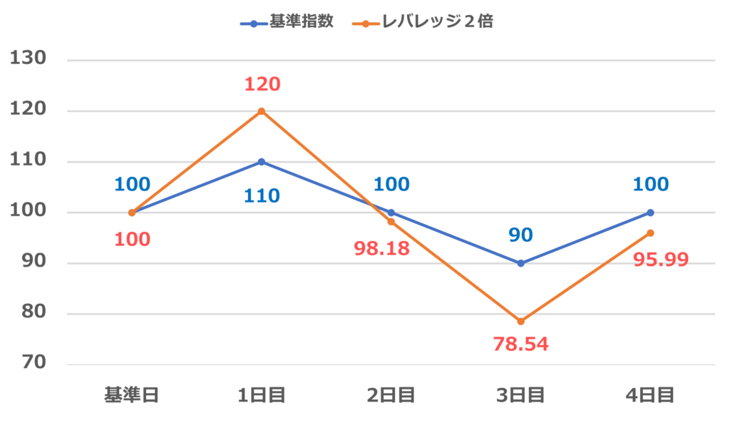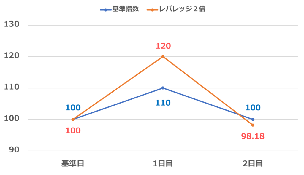 基準となる指数では2日目に100に戻したのに対して、レバレッジ2倍では2日目に98.18と1.82%の損失が発生しました。